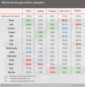 Müzik türüne ve ölüm sebeplerine bakınca ise dikkat çekici sonuçlar ortaya çıkıyor. Örneğin ölüm sebebi olarak cinayet, hip hop müzisyenleri arasında diğer tüm müzik türlerine göre daha yaygın. Kalp sorunlarından ve kanserden kaynaklanan ölümlerse daha çok blues ve caz müzisyenlerine has. Punk ve metal müzisyenleri içinse kazalar büyük bir risk kaynağı. Alkollü araç kullanırken yapılan ölümcül kazalar ve aşırı doz uyuşturucu kaza kapsamında değerlendirilmiş. Metal müzisyenleri için özel bir durumsa intihar. İncelenen metal müzisyenlerinin %20’ye yakın bir kısmı kendi hayatına son vermiş.